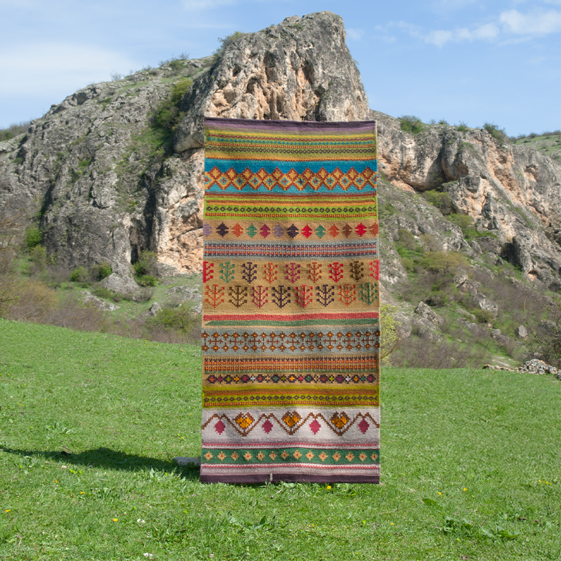 This handwoven wool rug tells the story of Georgian winemaking - from the rich soil that nourishes the vine, to the hands that harvest the grapes. Each motif reflects a stage of the journey: earth, sky, sun, vine, fruit, vessel, and celebration. Crafted with naturally dyed Georgian wool and woven in Dedoplistskaro, this piece is both a tribute to the land and a functional work of art.