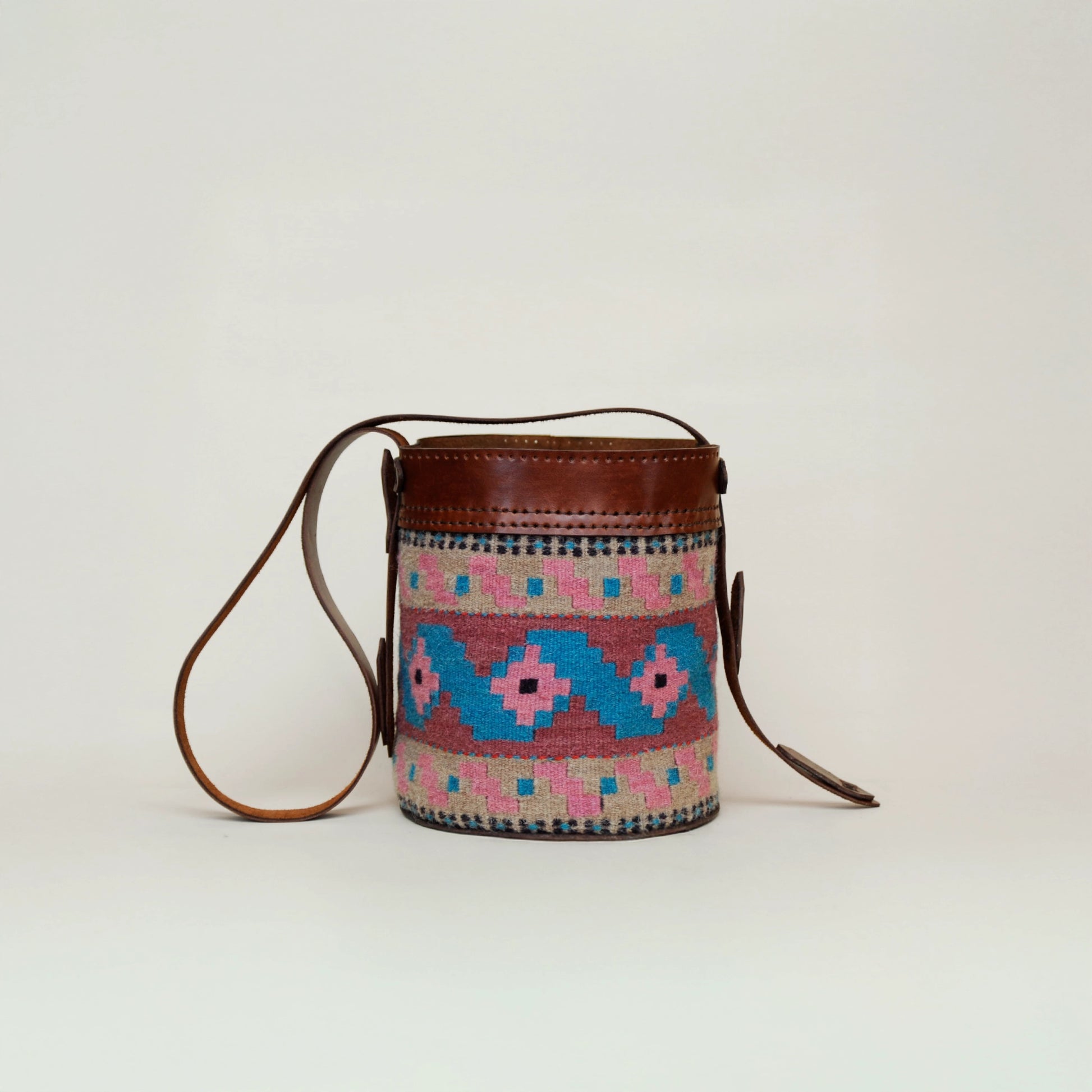 A vibrant bucket bag with colorful ornaments. combining soft leather with a handwoven wool panel in a traditional Georgian geometric design. Spacious, sturdy, and perfect for everyday use.