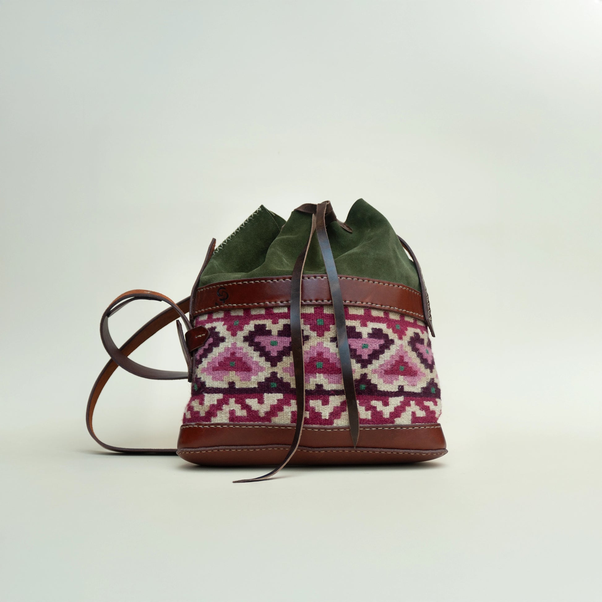 Handwoven wool bucket bag with a navy green soft leather top for added structure and contrast. The design blends traditional Georgian weaving with a practical, spacious form - ideal for everyday use.