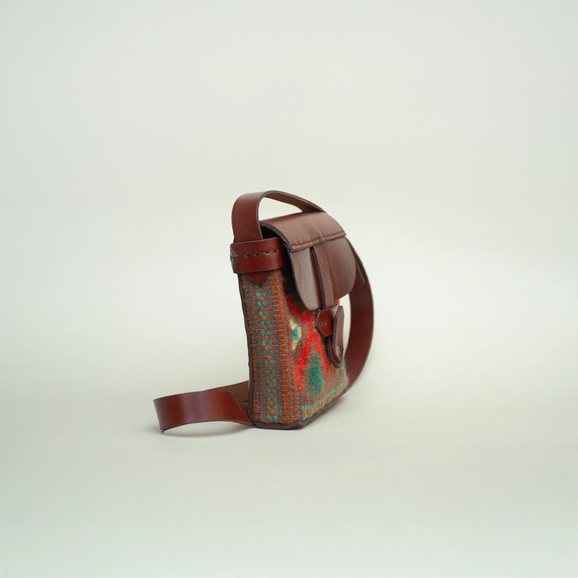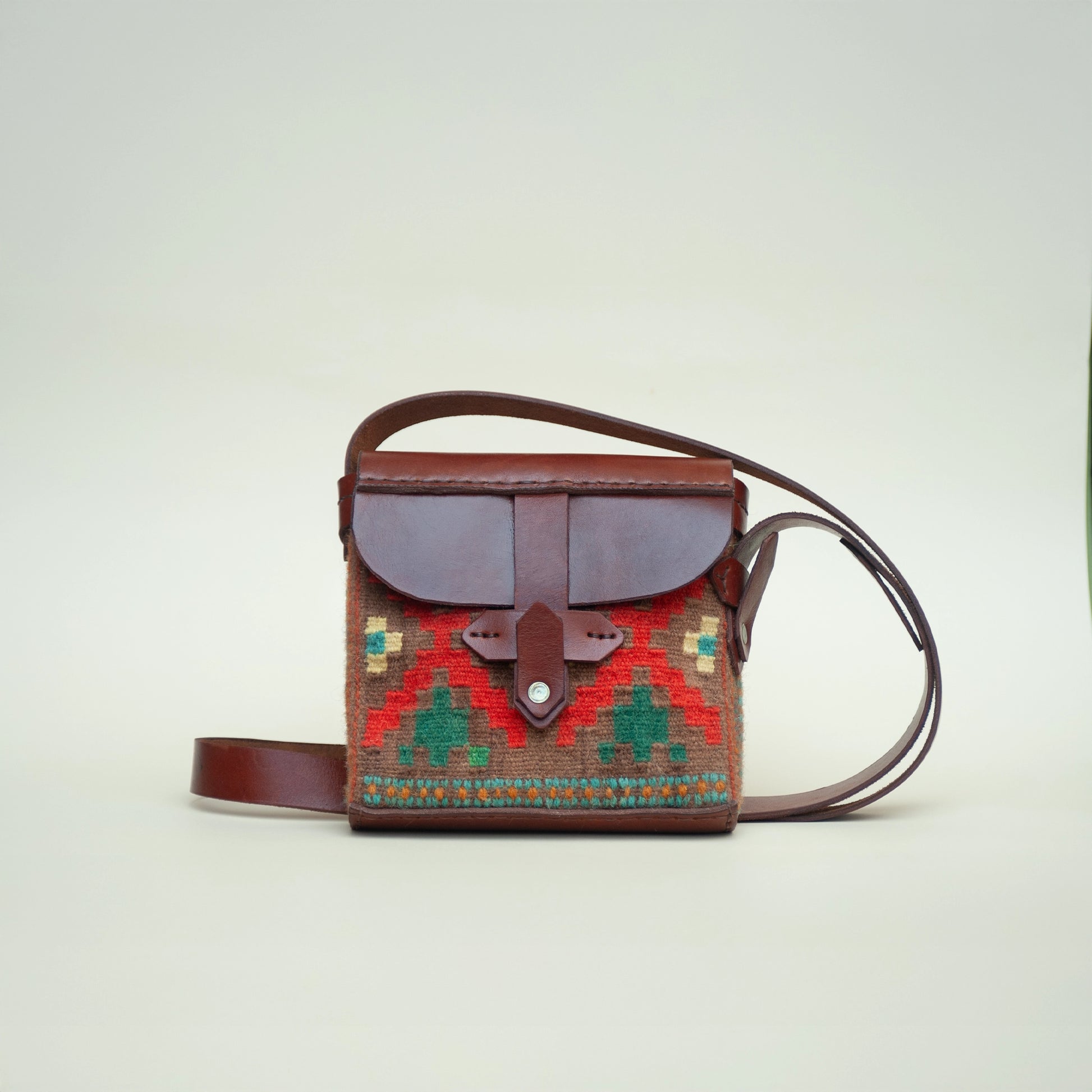 A small crossbody bag made from handwoven wool with a traditional Georgian pattern and ornaments. Ideal for hands-free use, with an adjustable strap. Secure closure and compact fit for daily essentials.