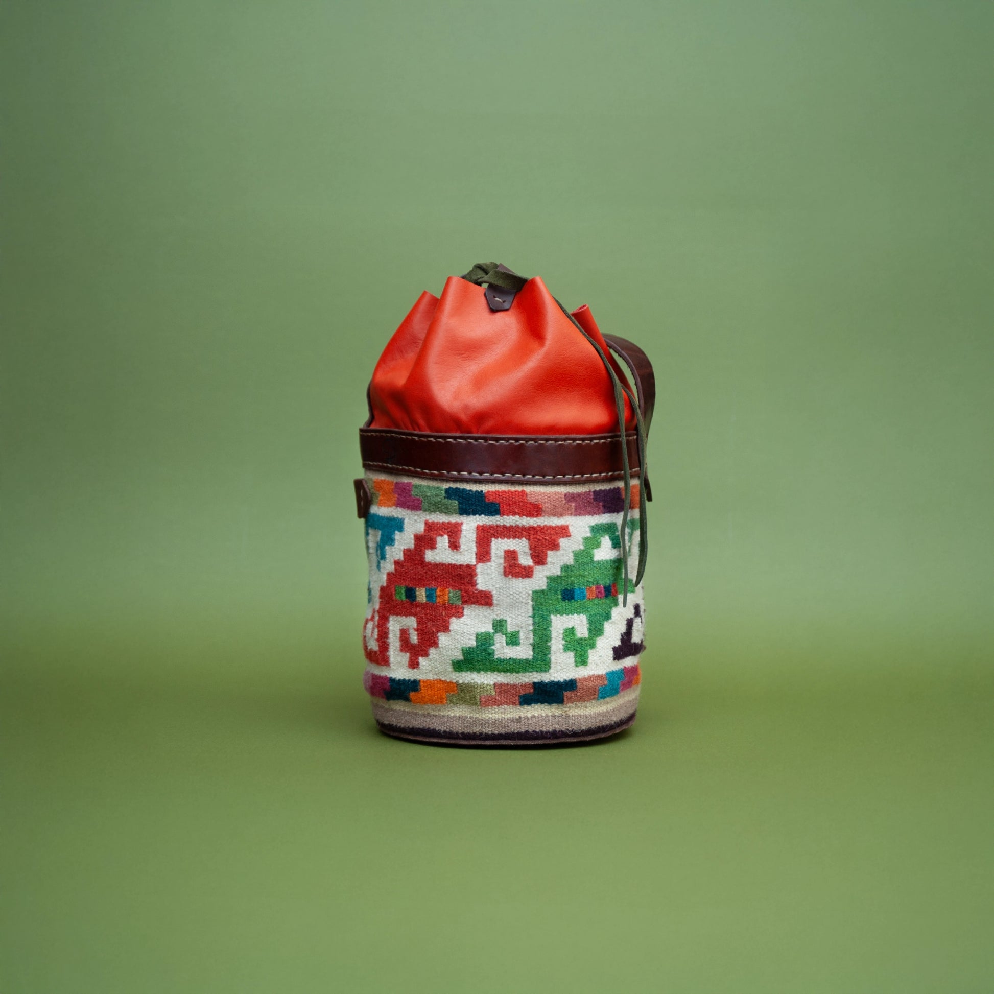 A vibrant orange bucket bag combining soft leather with a handwoven wool panel in a traditional Georgian geometric design. Spacious, sturdy, and perfect for everyday use.