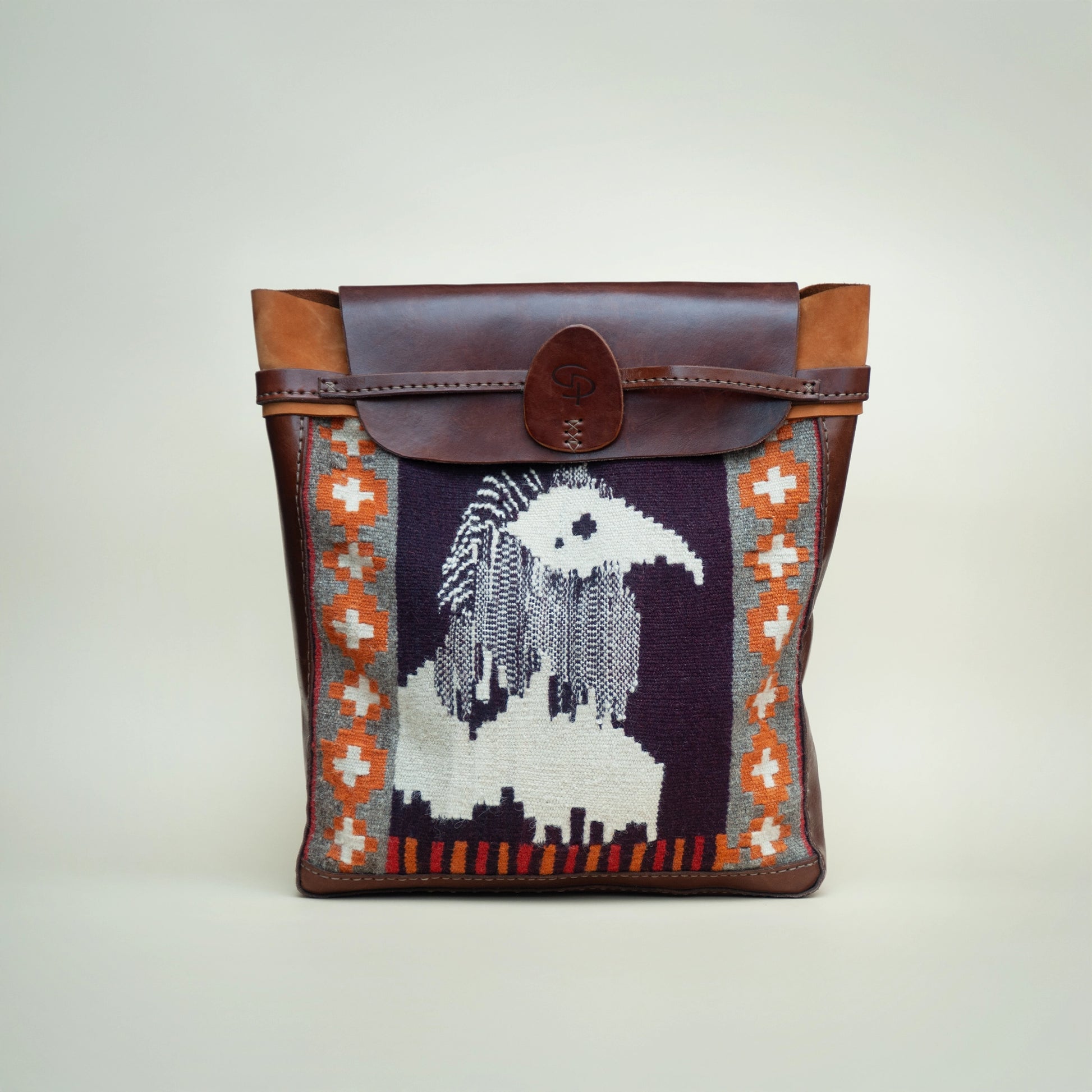 This handmade backpack is designed for daily work or travel. It fits a laptop, and has multiple compartments. The wool exterior features a traditional Vulture image created using natural dyes.